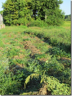 These are the sweet potatoes we weeded yesterday. In organic farming methods, since you don't use chemicals to control weeds, many times ground cover is planted. The sweet potatoes are in the hilled rows and in between is planted hairy vetch, clover and something else. When we weeded, we lay it in between the rows so it will decompose and put nitrogen back into the soil. It was a pretty dense jungle before we weeded. Many of the sweet potato vines were eaten by the deer, hence the spotty planting.